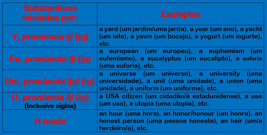 Esses artigos indefinidos ingleses correspondem em português aos artigos indefinidos singulares um e uma, entretanto, na língua inglesa a maioria dos substantivos não possui gênero. Portanto, o uso dos artigos é regido pelo som das primeiras letras dos substantivos.